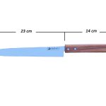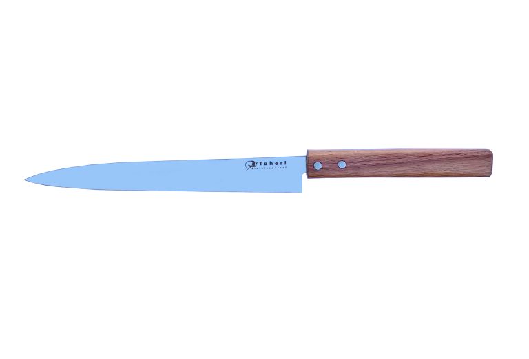 چاقوی سوشی تولید شده برند طاهری دارای تیغه ای به طول 23 سانتی متر میباشد و از استیل ضدزنگ یا همان استنلس استیل که درصد کربن بالاتری دارد ساخته شده است. همچنین دارای دسته ای ساخته شده از چوب گردو میباشد. این چاقو دارای لبه های بسیار تیز است و به کمک آن میتوانید بهترین و دقیق ترین برش ساشیمی یا رول سوشی را بدون مشکل انجام دهید. علاوه بر این میتوانید با یک حرکت و حداقل فشار برش خود را بدون نقص انجام دهید. وزن چاقوی سوشی برند طاهری بسیار سبک و حدود 94 گرم بوده که از ویژگی بارز این محصول میباشد.